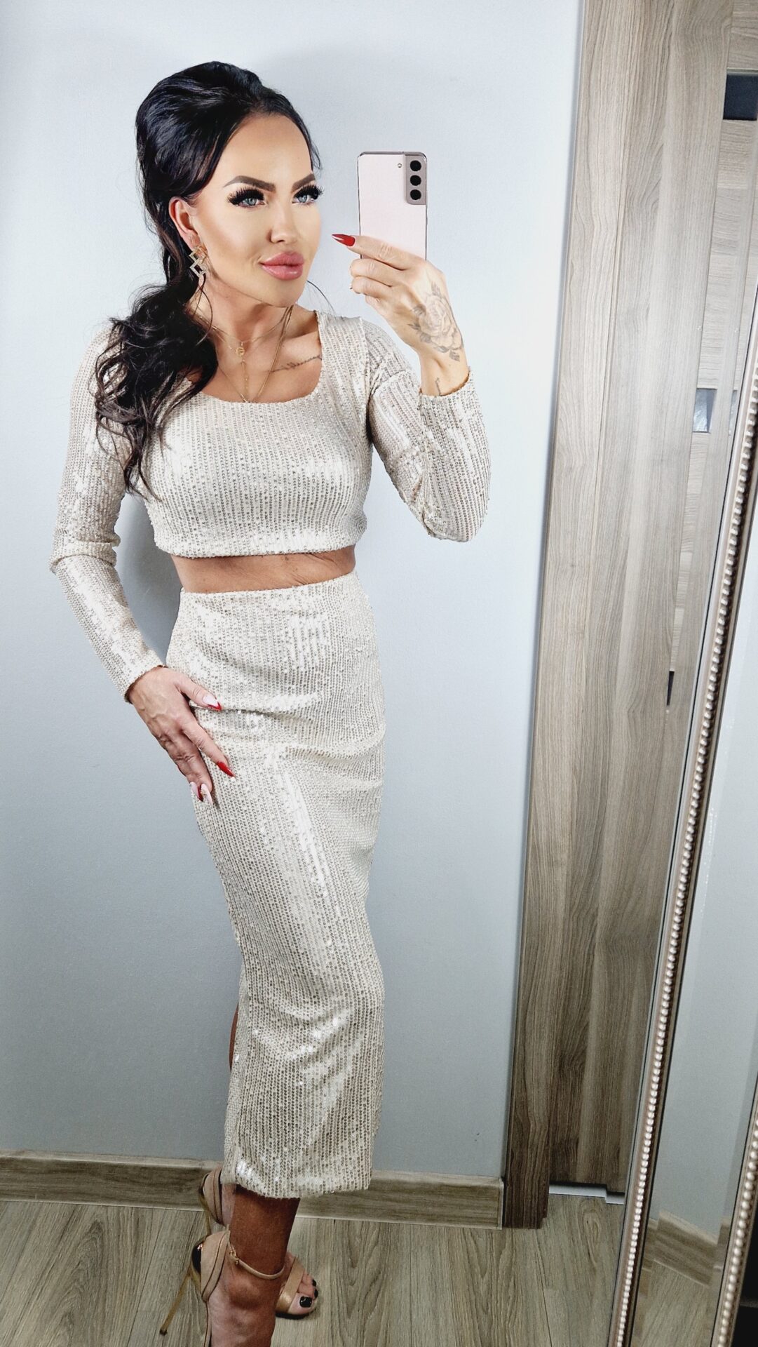 Dwuczęściowy Komplet Cekinowy Top i Spódnica Midi