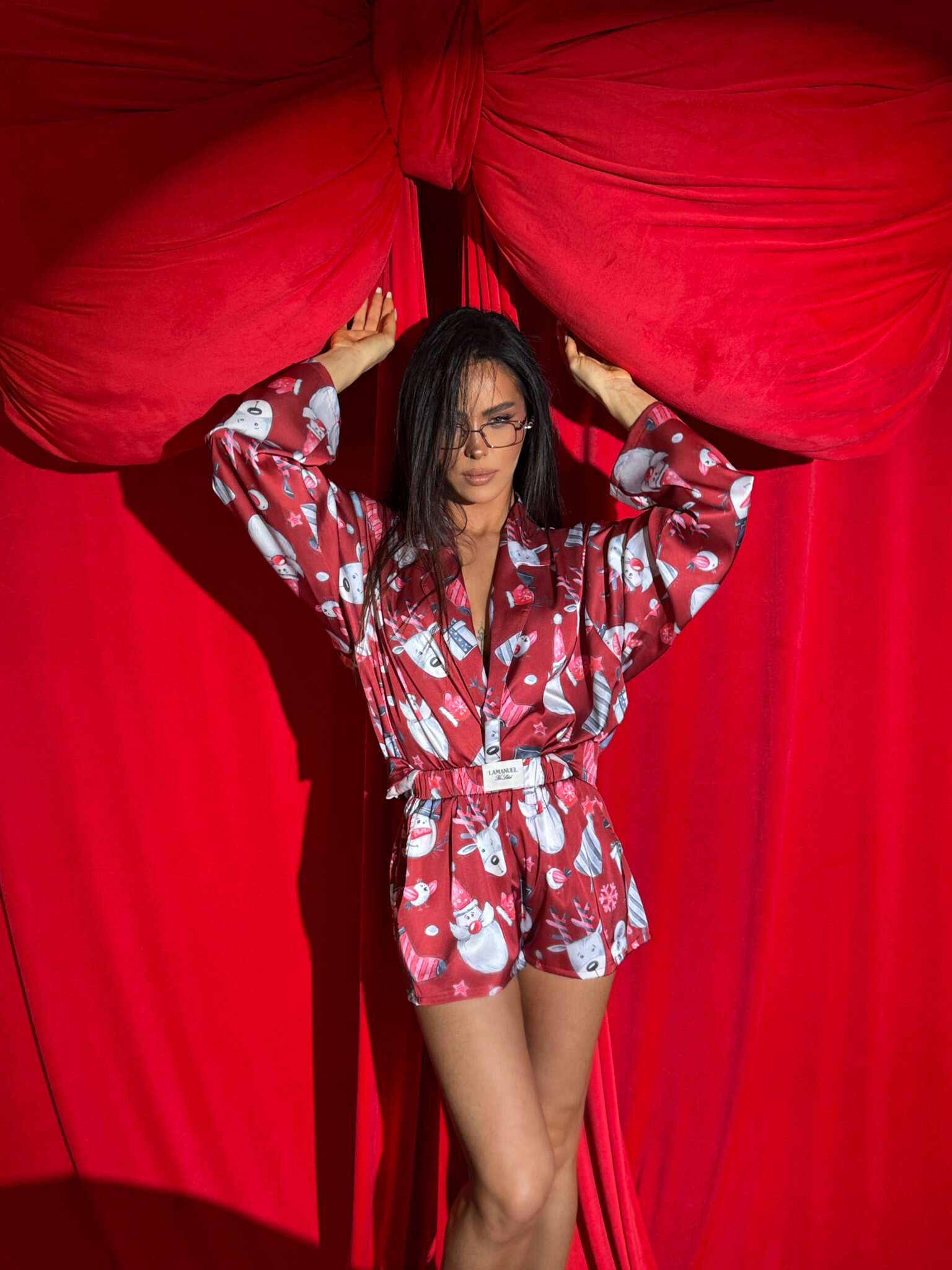 Dwuczęściowy komplet z kołnierzykiem i długim rękawem, który wygląda jak świąteczny klasyk w wersji premium. Luźna góra z zapięciem i krótkie szorty z elastyczną talią tworzą look wygodny, ale maksymalnie efektowny. Świąteczne printy w słodkim, dopracowanym stylu LAMANUEL przyciągają uwagę, a wykończenia i metka w talii podkreślają jakość. Idealny na świąteczne poranki, zdjęcia przy choince i wieczory, które mają wyglądać pięknie. Cute, wygodnie, ale z pazurem.Skład: 100% poliester
