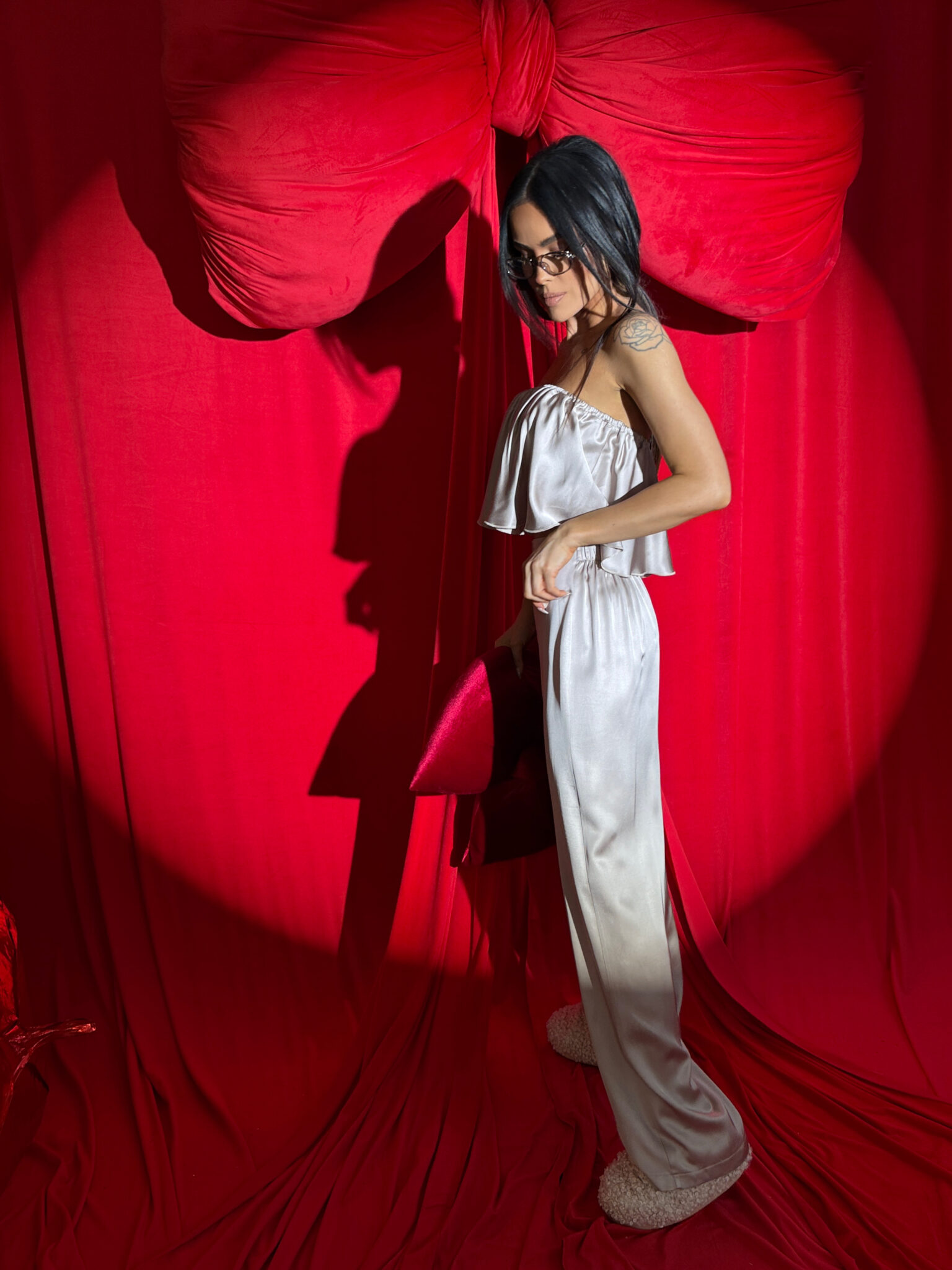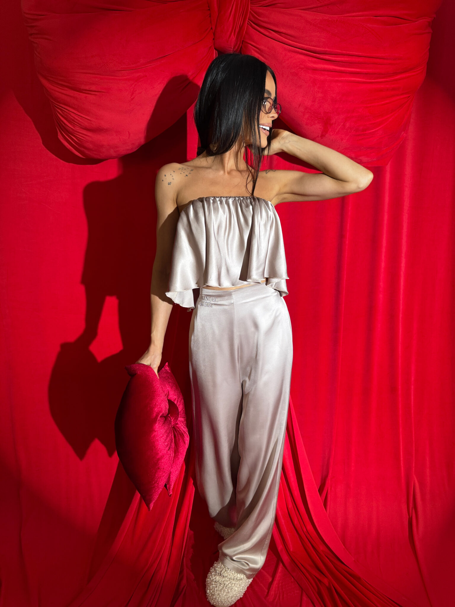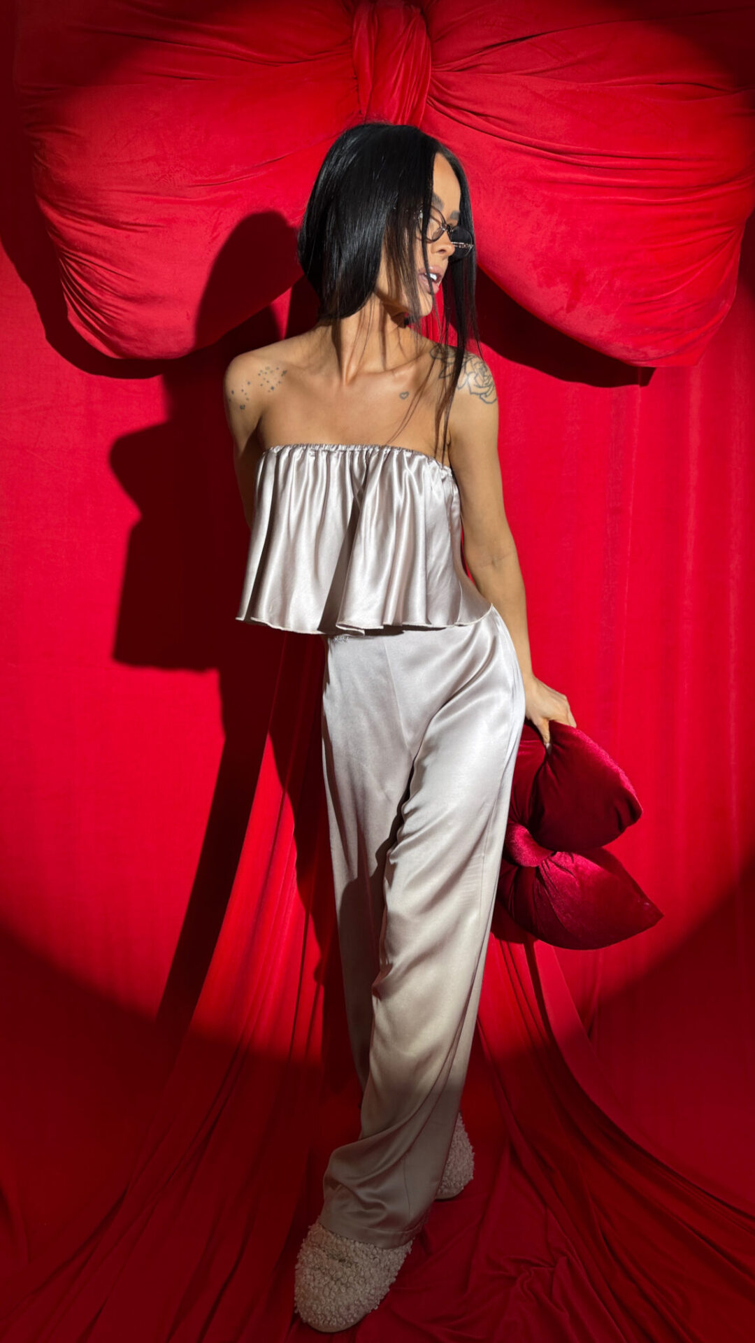 Ten komplet to kwintesencja luksusu w domowej odsłonie. Wykonany z naturalnej wiskozy o satynowym wykończeniu, zachwyca miękkością, subtelnym połyskiem i eleganckim ruchem tkaniny przy każdym kroku. Top bez ramiączek z falbaną delikatnie podkreśla ramiona, a szerokie spodnie z wysokim stanem i efektownym marszczeniem z tyłu pięknie układają się na sylwetce – zwłaszcza na biodrach i pośladkach.To nie tylko komplet do domu. To styl, który możesz śmiało zabrać na wieczór, do hotelu, na prezent. Klasa, jakość i dopracowany detal – dokładnie tak, jak definiuje to LAMANUEL.Skład: 100% wiskoza satyna