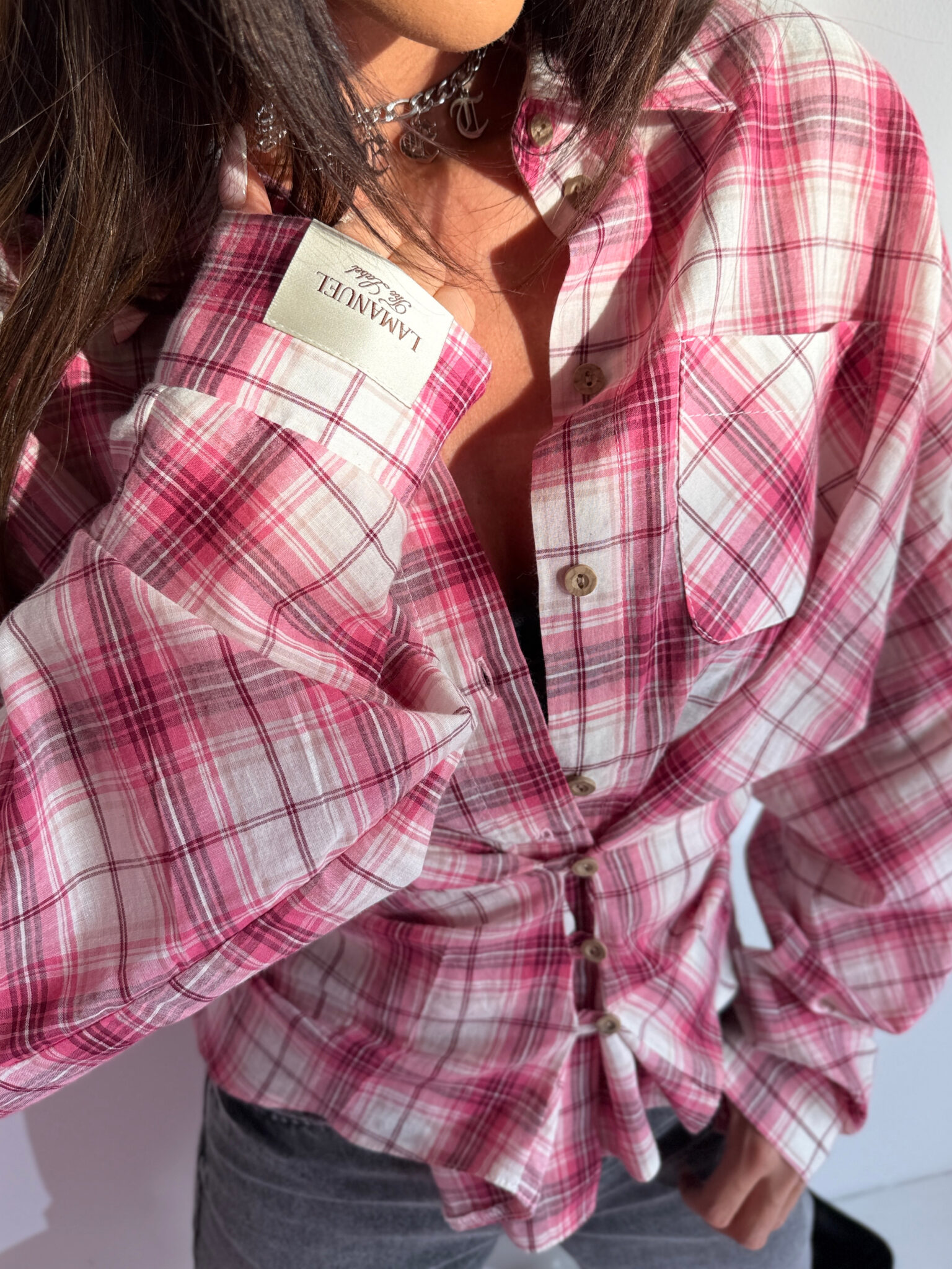 Koszula z lekkiej, przewiewnej tkaniny, która swobodnie układa się na sylwetce i daje pełen komfort noszenia. Model o luźniejszym fasonie z klasycznym kołnierzem i kieszenią na przodzie, który możesz stylizować na kilka sposobów. Dzięki dodatkowym guzikom po bokach koszulę można zapiąć w talii, tworząc efekt podkreślonej, kobiecej sylwetki. Guziki możesz zapiąć w całości, mocniej zaznaczając talię, albo tylko do połowy, uzyskując luźniejszy, nonszalancki efekt z delikatnym przewężeniem. Świetnie wygląda zarówno noszona klasycznie, rozpięta na top, jak i spięta w talii jako główny element stylizacji. To model, który daje wiele możliwości – od casualowych zestawów z jeansami po bardziej wyraziste, warstwowe stylizacje. Lekka, kobieca i bardzo efektowna.Skład: 100% bawełna