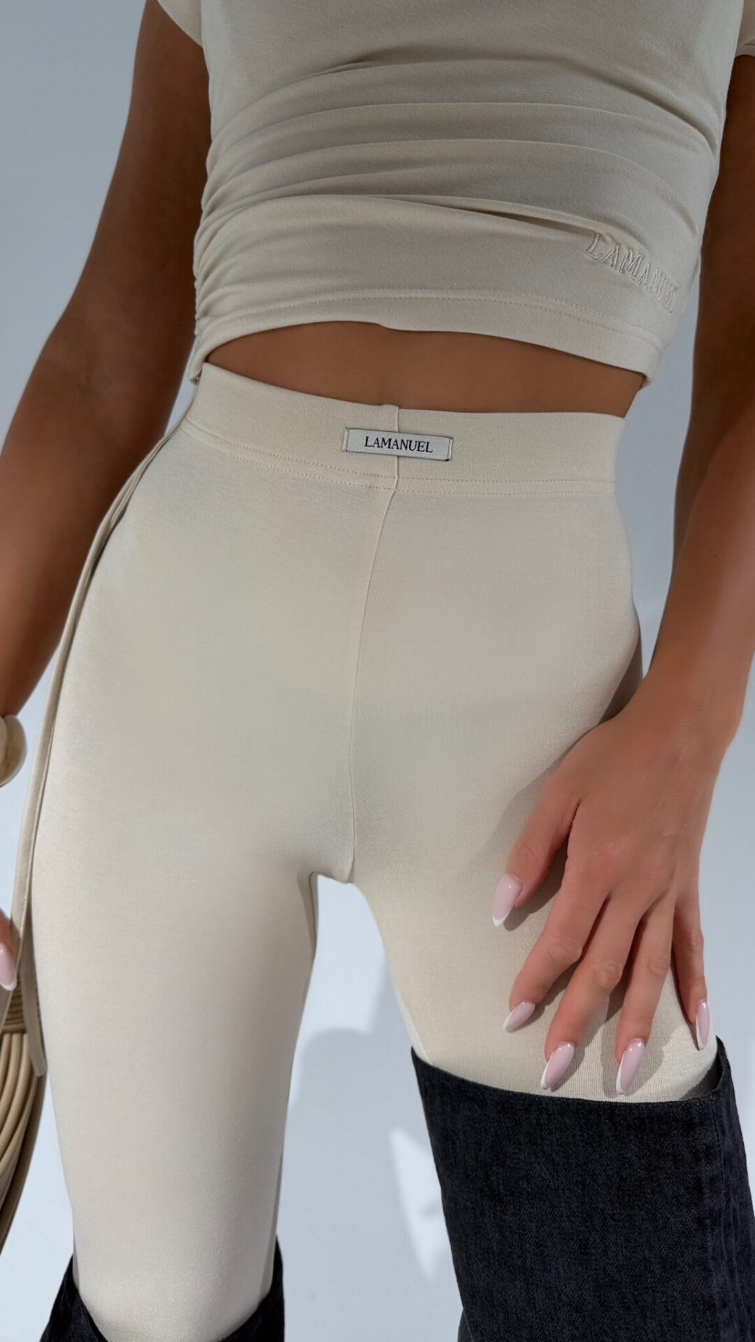 Legginsy z elastycznej wiskozy o dopasowanym kroju, które pięknie podkreślają talię i sylwetkę. Wysoki stan zapewnia wygodę i sprawia, że całość wygląda bardzo estetycznie. Materiał miękko otula ciało i pracuje razem z nim, dzięki czemu legginsy świetnie sprawdzają się zarówno w codziennych stylizacjach, jak i w bardziej dopracowanych, wieczorowych zestawach. To uniwersalna baza, którą możesz łączyć z topem w komplecie albo zestawiać z oversize’ową koszulą, swetrem czy marynarką. Minimalistyczne, kobiece i bardzo wygodne.Skład: 95 % wiskoza 5% elastan