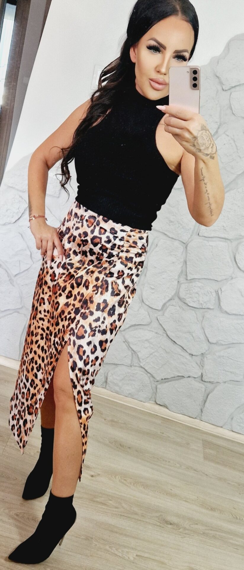 Odkryj naszą elegancką spódnicę maxi z satyny w modny wzór panterki. Idealnie dopasowuje się do sylwetki, zapewniając komfort noszenia przez cały dzień. Lekko rozkloszowany dół dodaje jej lekkości i swobody ruchu, a długość maxi sprawia, że świetnie sprawdzi się zarówno na co dzień, jak i na wyjątkowe okazje. Dodaj odrobinę dzikości do swojej garderoby z naszą satynową spódnicą w panterkę!