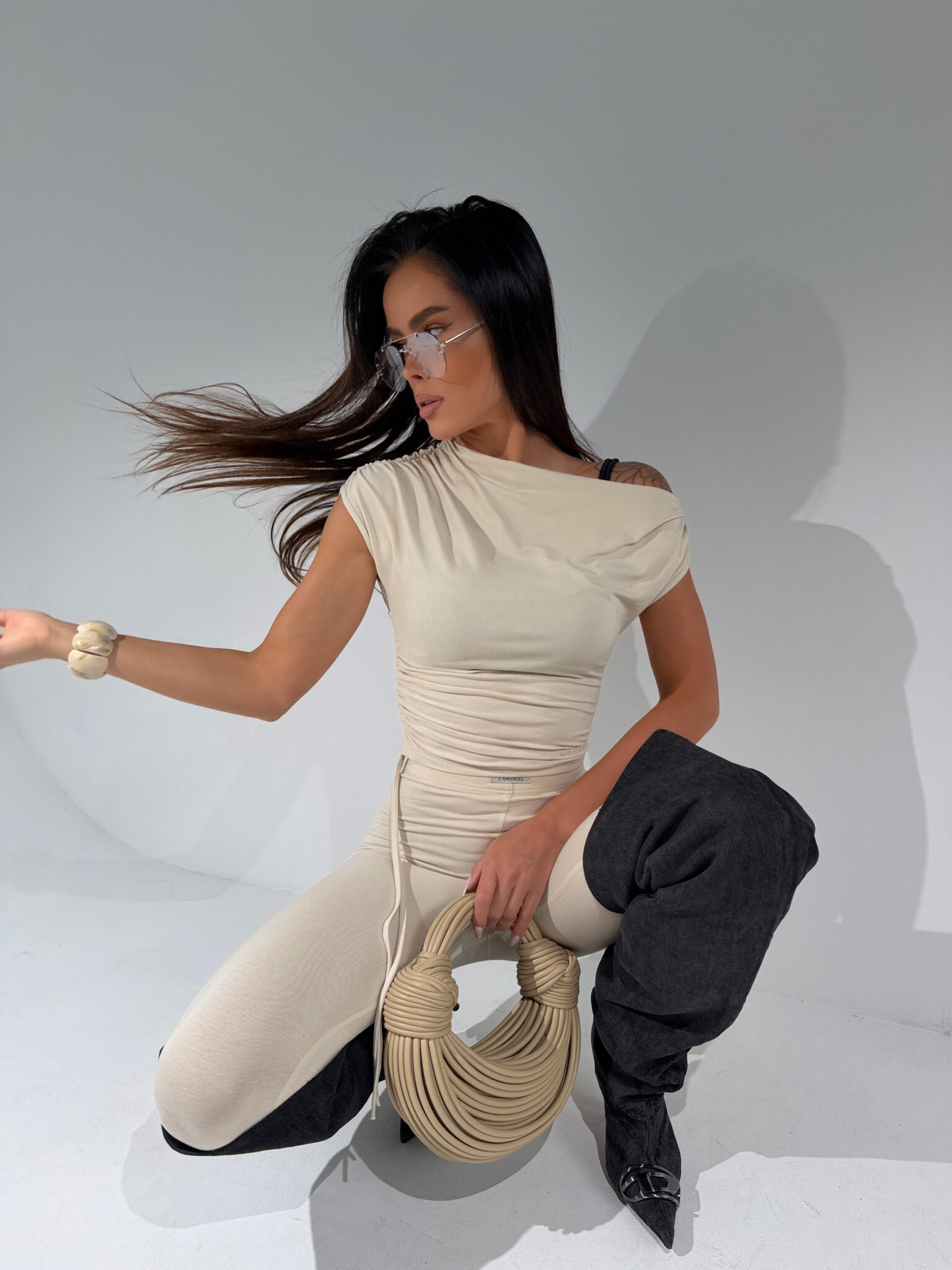 Top z elastycznej wiskozy, która idealnie dopasowuje się do sylwetki i miękko układa na ciele. Model z efektownym marszczeniem po boku oraz regulacją długości, dzięki czemu klientka może dopasować go do stylizacji – bardziej klasycznie lub w wersji skróconej. Asymetryczna linia ramion i delikatne drapowanie w okolicy talii podkreślają kobiece kształty i optycznie modelują sylwetkę. Materiał jest przyjemny w dotyku, oddychający i komfortowy w noszeniu, a jednocześnie trzyma formę. To propozycja, która świetnie sprawdzi się zarówno w komplecie, jak i jako osobny element do jeansów, marynarki czy spódnicy. Uniwersalny, sprzedażowy fason, który dobrze leży na różnych typach sylwetek i wpisuje się w aktualne trendy dopasowanych, kobiecych form.Skład: 95% wiskoza 5% elastan