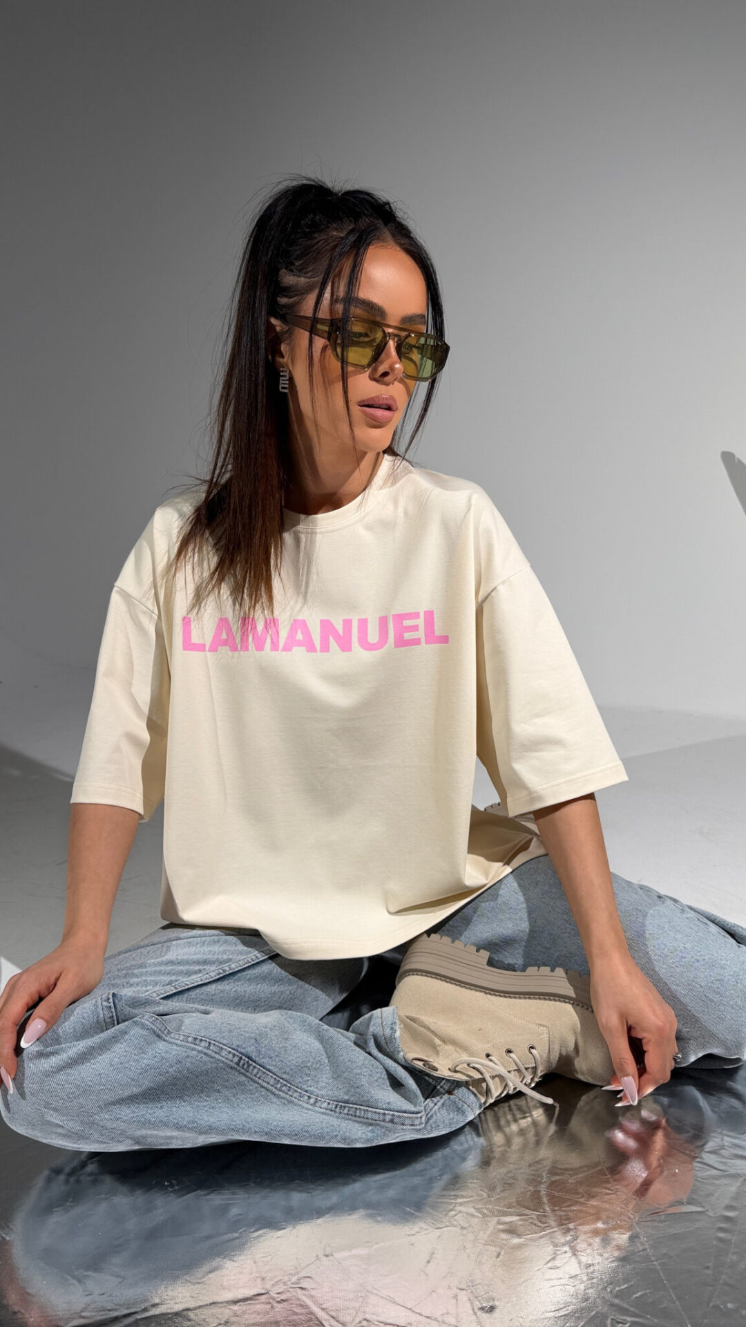 Oversize’owy t-shirt o luźnym kroju z wyraźnie opuszczoną linią ramion i szerokim rękawem. Na przodzie nadrukowane logo lamanuel, które przyciąga uwagę i nadaje charakteru. Uniwersalny fason unisex sprawdzi się w stylizacjach streetowych, sportowych i casualowych. Idealny do noszenia solo lub warstwowo – zawsze robi wrażenie bez wysiłku.Skład: 100% bawełna